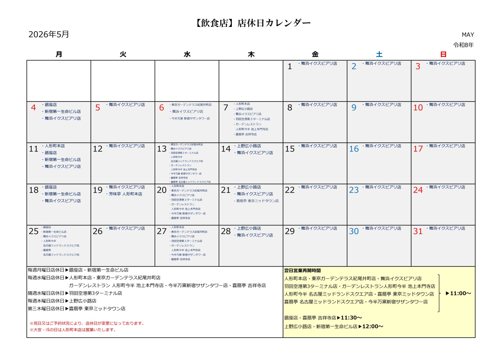 | 東京ガーデンテラス紀尾井町店 | 8日(水) 15日(水) 22日(水) 29日(水) | 13日(水) 20日(水) 27日(水) |