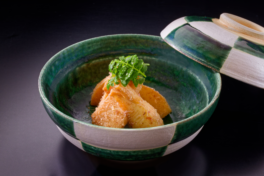 シャキシャキの新筍は、粉節(こぶし)の香りと相まって、旨みが引き立つ深い味わいをお楽しみいただける一品となっております。